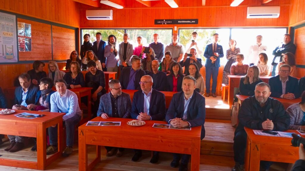 Učebna o rozměrech 6,5 na 10 metrů má kapacitu 36 žáků a umožňuje celoroční provoz. Je navržena jako variabilní a multifunkční dřevostavba – její interiér lze upravovat, protože stoly a lavice je možné velmi rychle složit. Celý prostor tak snadno přeměníte například na divadelní sál s pódiem, pohybovou zónu nebo komunitní centrum. Proto Archimedes slouží nejen dětem a učitelům ze základní a mateřské školy, ale i široké veřejnosti.